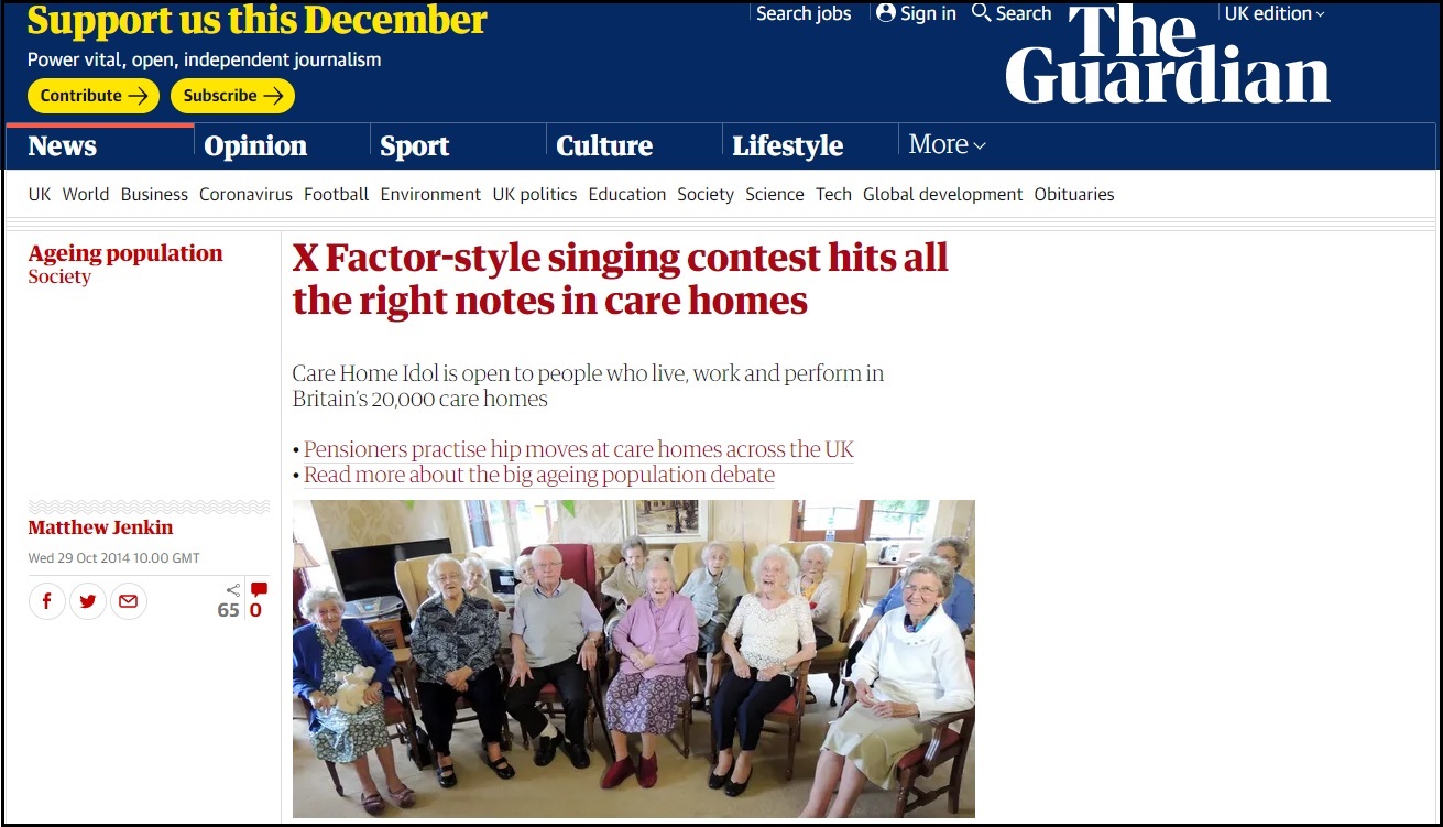 I was delighted to find myself and two members of “The Oldest Choir in the World” from St John’s House at Kirk Hammerton, mentioned in an on-line article on The Guardian website this week. We had been interviewed in connection with the Care Home Idol competition, an X Factor style competition for Care Homes, organised by carehome.co.uk and it was great to see the benefits of music for the elderly being endorsed on such a prestigious forum.